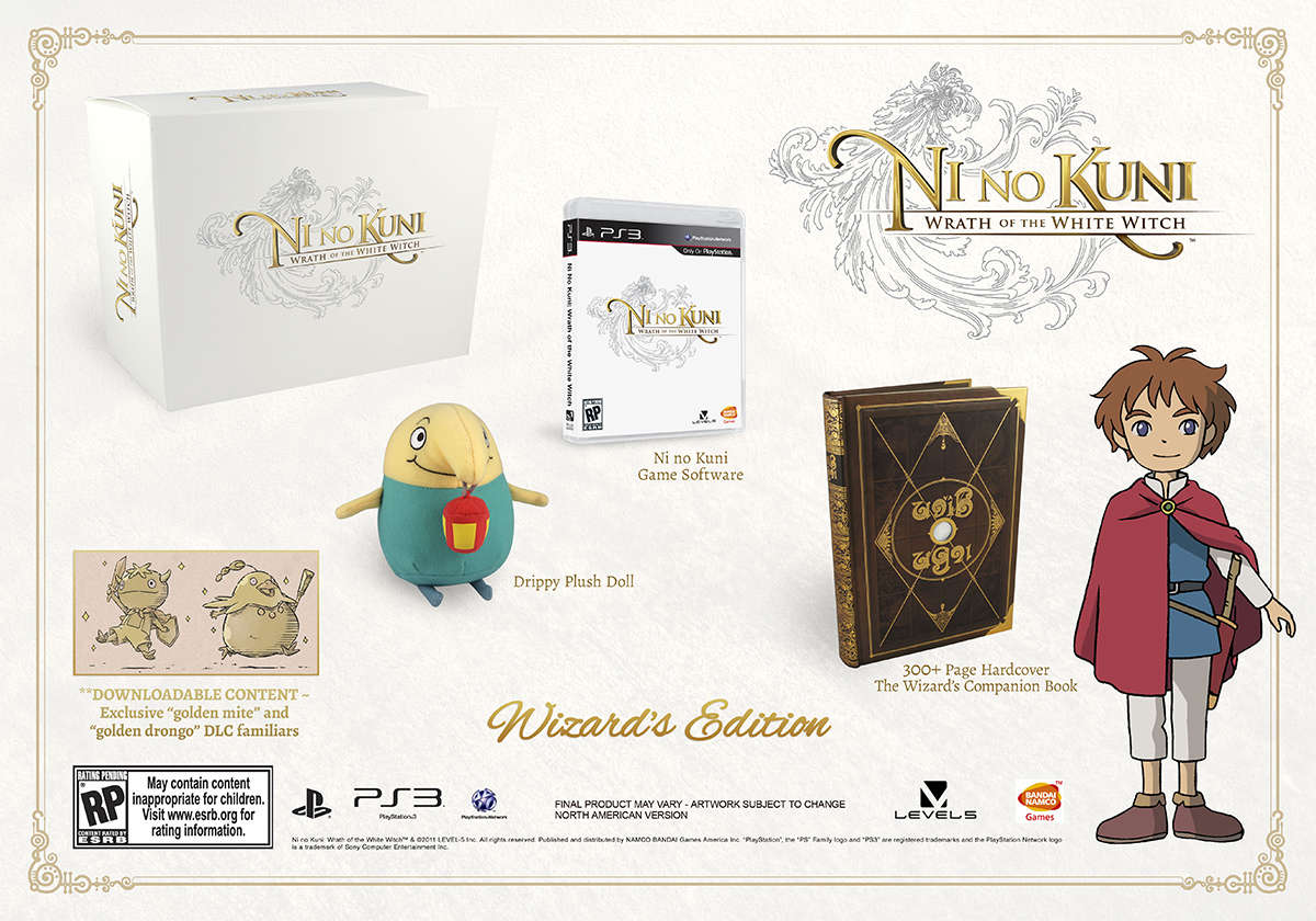 Esta edición de colección trae un peluche de Drippy, uno de los adorables acompañantes a tu personaje dentro del juego, un código para descargar algunos acompañantes dentro del juego, un glorioso libro de 300 páginas que sirve como guía del juego y galería de arte y una copia del esperado Ni No Kuni para el PS3. Todo esto por la módica cantidad de $100.00 USD, que podría traducirse en un riñón o parte de tu hígado aquí en Mexico, si es que llegamos a ver esta edición por aquí.