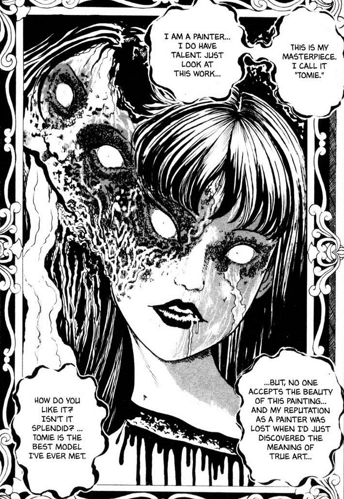 «Tomie» es un excelente punto de convergencia entre las posibilidades de la obra de Junji Ito. Si bien es una saga prolongada como «Uzumaki» o «Gyo», se conforma principalmente por historias cortas que podrían verse de manera aislada (como la gran mayoría de su obra). Tomie, como personaje, no es sólo una de las mejores she-monster que me he encontrado en un cómic, sino una maravillosa encarnación directa del terror al ser a su vez victimario, víctima, tragedia, monstruo y resurrección.