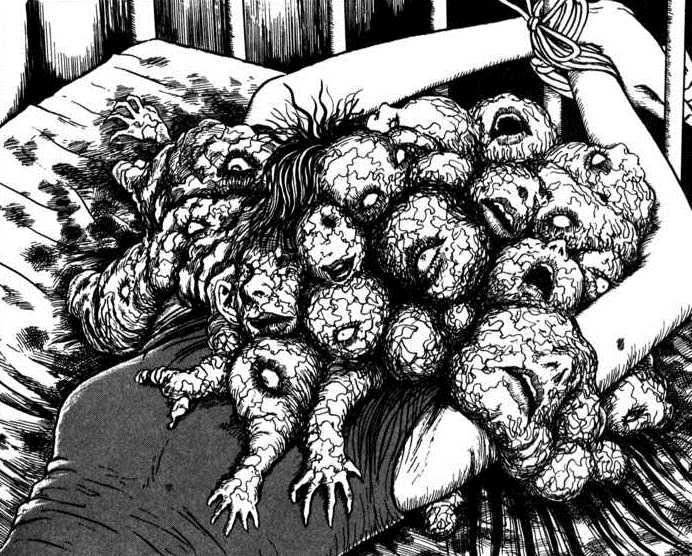 Uno podría pensar que desde la tragedia de la bomba atómica, en el pensamiento colectivo de Japón el cuerpo se convirtió en un espacio de posibilidades. Sus monstruos gigantes distaban de las fantasías de colonización de sus contrapartes estadounidenses, y las producciones artísticas aprovecharon cualquier comunión extraña que dejara en claro que el cuerpo no es un lugar inalterable (¿en qué otro país podríamos encontrar con tanta facilidad tentáculos atacando colegialas, geishas robots, personajes que han sencillamente reemplazado alguna parte de su cuerpo por cualquier instrumento, y un larguísimo y variado etcétera?). En el caso de Junji Ito, a diferencia de otros autores, este horror corporal nunca se ha fundamentado en una cuestión de ‘más’ o ‘menos’, de la degradación corporal, sino de la capacidad de reinventarse, reconstruirse. Tomie, de este modo, es una y es mil, conforme avanza la trama vamos viendo que la muerte no es su único destino ni su belleza su única capacidad.