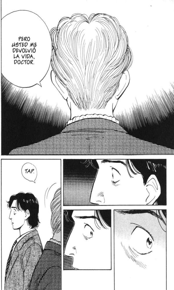 La historia se construye en gran medida a partir de ausencias, desconciertos. No sólo porque gran parte de *la verdad* (un término subjetivo siendo que muchas distintas historias se entremezclan con la línea principal) tiene que irse descubriendo, sino incluso porque hay muchas cosas que jamás terminaremos de saber. Al igual que el principal protagonista, Tenma, tenemos que movernos a través de este universo oscuro suponiendo, intuyendo qué es lo que se va gestando en las sombras, qué es lo que está sucediendo en esos momentos en que no podemos ver. Si encontramos en el manga imágenes increíblemente poderosas, muchos momentos consiguen ser a su vez poderosos precisamente porque no hay imágenes que nos los muestren.