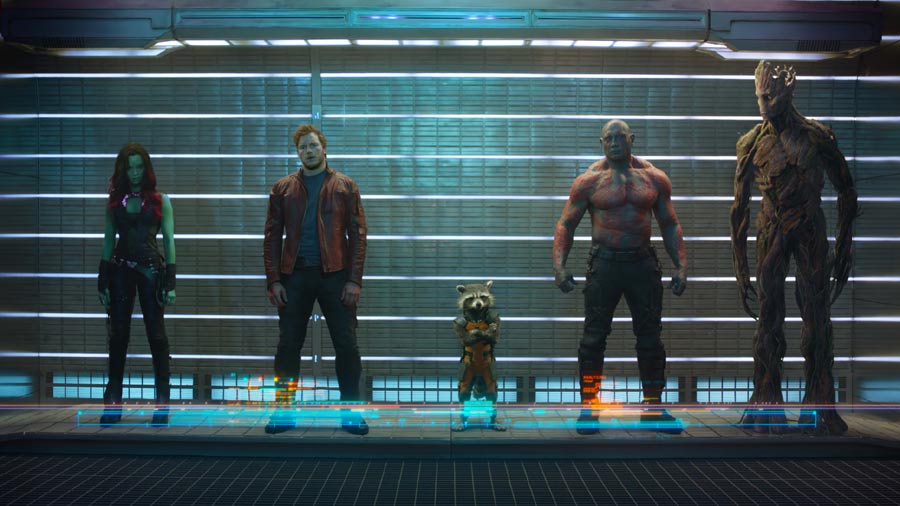 Obviamente la puesta en escena parte de cómo conseguir que todos estos personajes disparejos terminen por ser un sólo equipo: Un terrícola (Peter Quill) que ha terminado formando parte de un grupo de ladrones especiales hasta que se hace con el Orbe, una esfera que al parecer todos quieren, y decide seguir sus propios intereses; un equipo de cazadores de fortunas compuesto por un árbol (Groot) y un mapache (Rocket) que se encuentran con el mencionado ladrón y deciden hacerse con la recompensa que cae sobre su cabeza; Gamora, la hija adoptiva de un titán espacial que ahora sirve a otro villano loco, Ronan, y cuya misión es recuperar el Orbe; y Drax, un fortachón incapaz de no muchas luces que ve en ellos la oportunidad de llamar la atención de Ronan para poder vengarse de él. Tome todos estos ingredientes, agregue muchos efectos especiales, naves, armas, gente con piel de colores, y el caos que saldrá de la mezcla comenzará a tener la forma de «Guardianes de la Galaxia».
