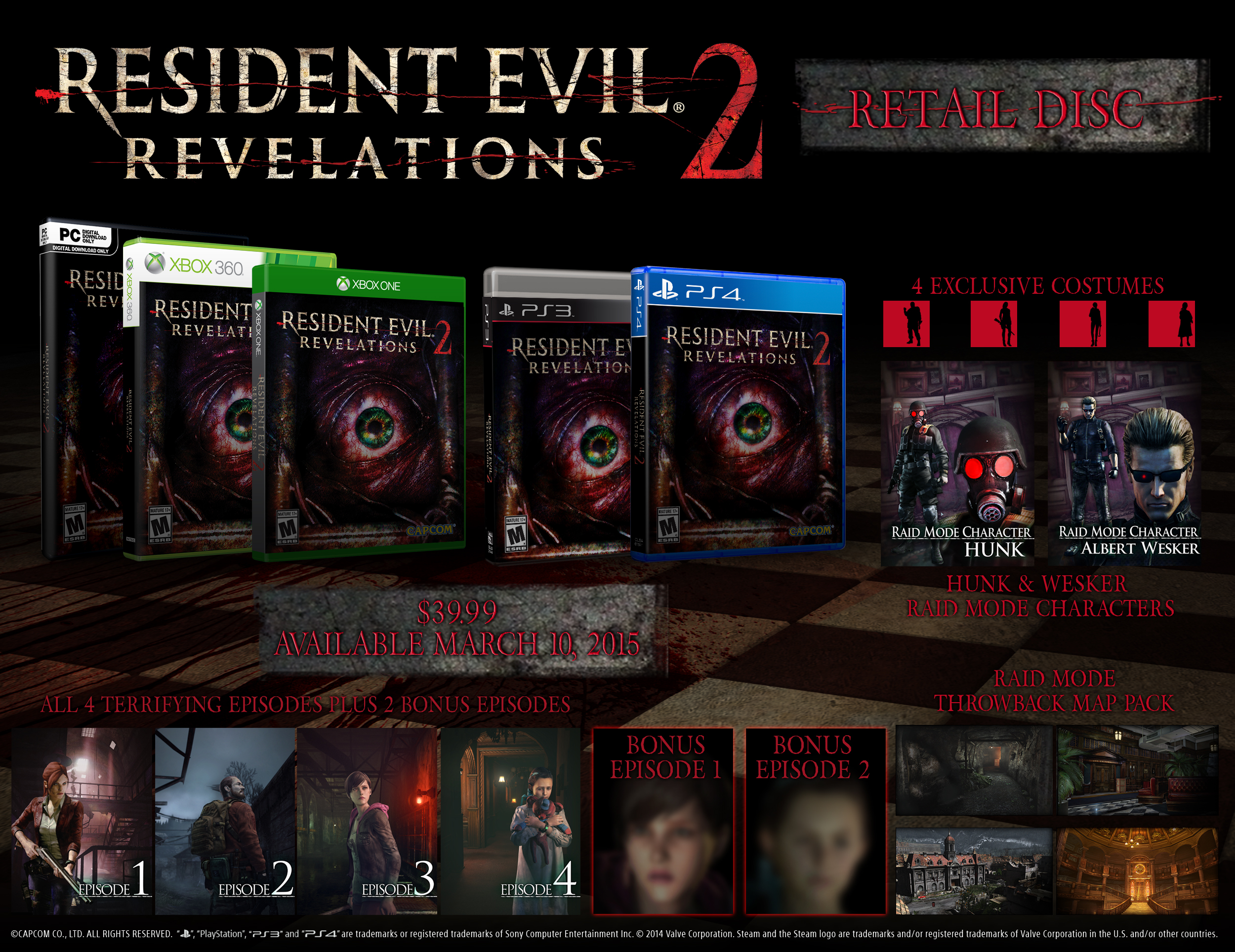 La temporada Resident Evil: Revelations 2 comienza a partir del 17 de febrero, con el lanzamiento del primer episodio. El resto de los capítulos se estrenarán el 21 de febrero, 3 de marzo y 10 de marzo respectivamente. Cada uno de estos episodios también traerá contenido para el modo RAID y podrán ser adquiridos individualmente por un precio de $5.99 USD.