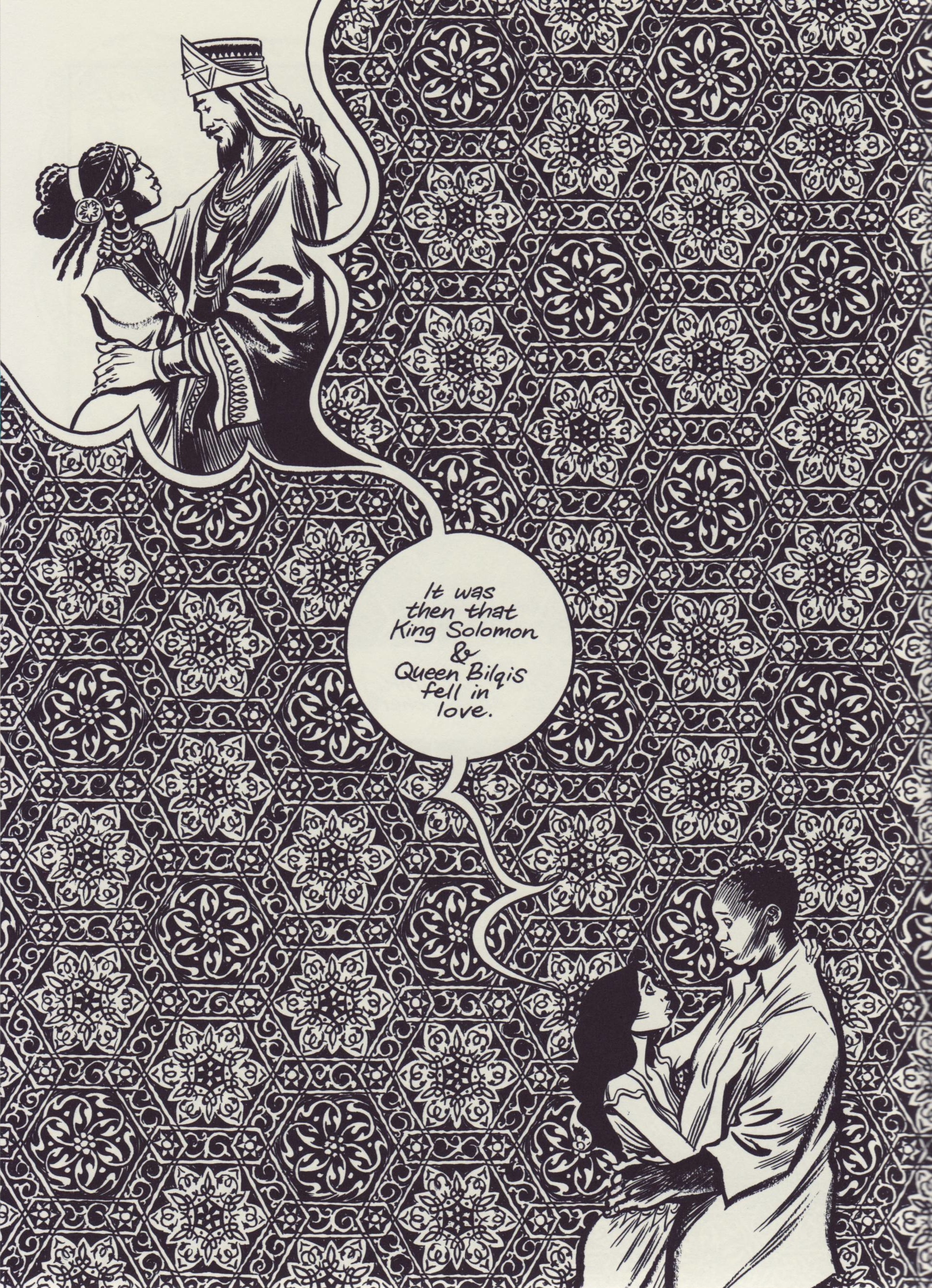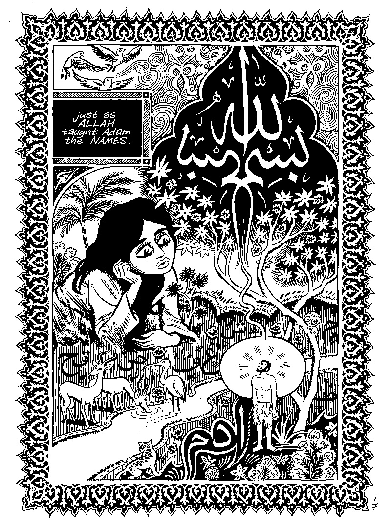 «Habibi» es todo eso y no exactamente eso. Una pieza curiosa con tantos puntos fuertes (muy fuertes) como terriblemente cuestionables. Lo mejor es, sin duda, el increíble arte de Thompson y su cuidadísima representación estética árabe que abarca cada aspecto de la obra, desde su concepción teórica hasta el más pequeño detalle al margen. No es de sorprender que la elaboración total de la novela le llevara tantos años si tomamos en cuenta que hay numerosas páginas que son piezas perfectas en sí mismas, además de reforzar constantemente el valor de la palabra y la fuerza del texto, tema recurrente en la historia. Esto solo, sumado a una historia que sin ser muy original en sus líneas más generales, cuenta con puntos también poderosos, son suficientes para cautivar y atrapar fuertemente al lector. Es evidente el sentimiento que el autor ha puesto en toda esta recreación textual/visual/espacial/poética y es, además, una pasión que se percibe y se transmite en muchos momentos.Y sin embargo, por el otro lado, si la propia extensión de la novela no nos hace dudar, el transcurso de la propia historia muestra varios puntos en que el ritmo se ve interrumpido y uno no puede evitar preguntarse si todo lo que trata de conjugarse en sus páginas es realmente necesario. El principal problema de «Habibi» es, en mi apreciación, que Thompson pretende concentrar un abrumador número de elementos en su historia al punto que, incluso de lograrlo en apariencia, da la impresión de terminar por perder la guía en sus propias intenciones. Por querer darle demasiada dimensión a Dodola y Zam, condena al resto de sus personajes a ser caricaturas planas y estereotipos; al hacer tanto énfasis en el Corán se pierde la expresión cotidiana e inmediata del islam; se esfuerza tanto por hacer de Dodola su propia leyenda y de Zam un prisionero de sus culpas, que en muchas ocasiones los reduce a una reiteración obscena de la violencia (muchas veces sexual) y la opresión.