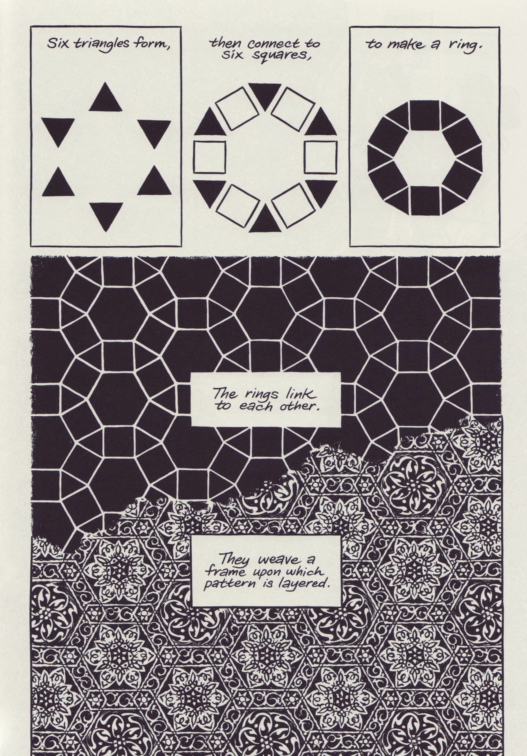 Esta historia, que ya en sus recursos narrativos está enmarcada por sus influencias, el dejo oral u onírico, la mitología, y una serie de recursos retóricos textuales y visuales; se acompaña por una serie de referencias que denotan una profunda investigación sobre el islam, el alfabeto y caligrafía árabe, y otros elementos culturales que se van introduciendo a través de distintos mecanismos. Explicaciones directas, elaboradísimos marcos, juego de imágenes en que el texto y los personajes se emulan mutuamente; que es el punto donde más claramente vemos la intención del autor por acercarse humanamente a un contexto cultural y religioso cuya imagen ha sido más que atacada y manipulada por los medios, especialmente los estadounidenses después del 9/11 (aunque la novela se publica en 2011, Thompson trabajaba en ella desde el 2004).