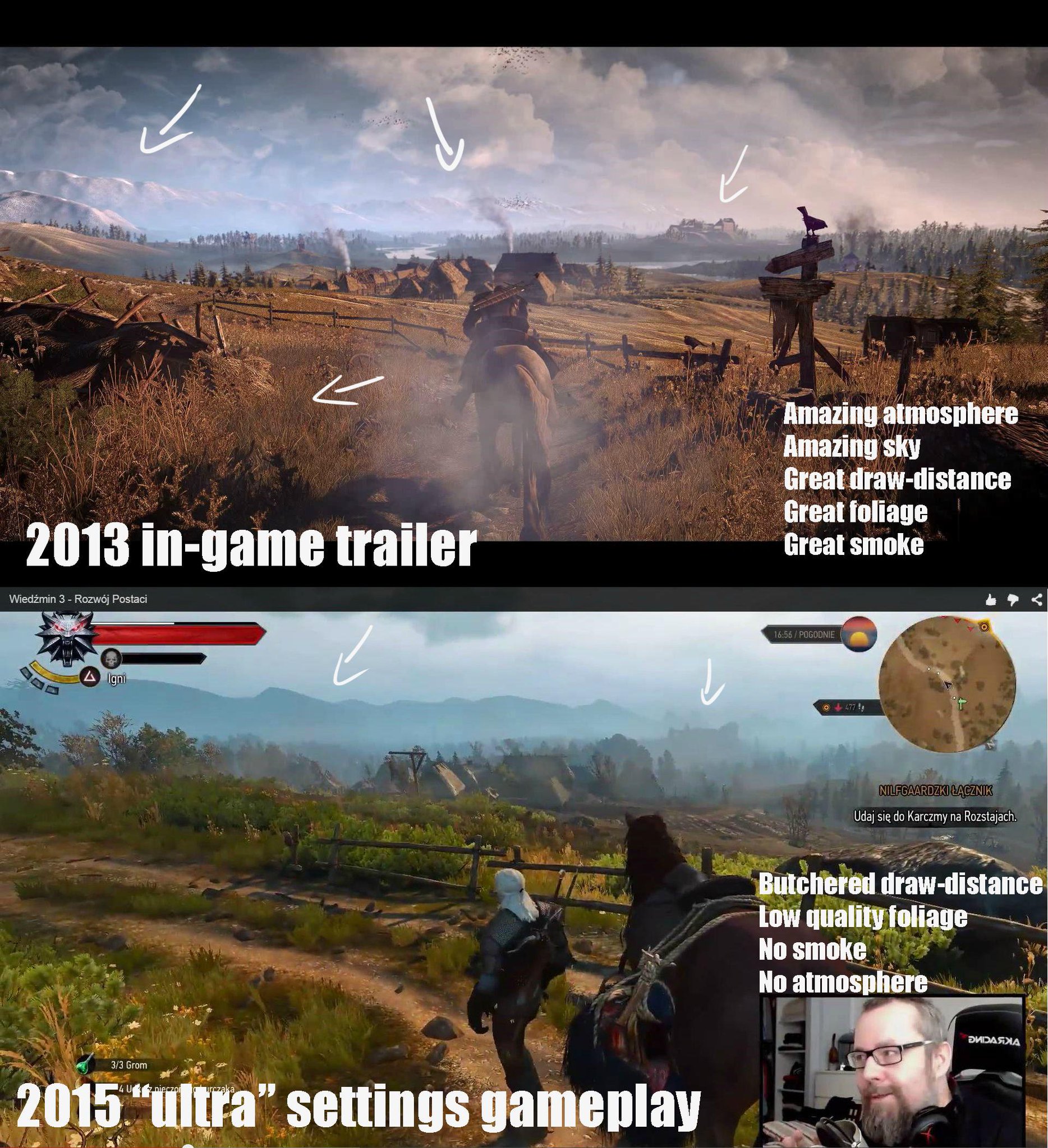 DesconectadoThe Witcher III ha tenido un lanzamiento de ensueño. De hecho, habría sido perfecto si no fuera por las quejas de algunos usuarios de PC acerca de la disparidad entre la versión final y la mostrada en un tráiler de 2013 durante los premios VGX.